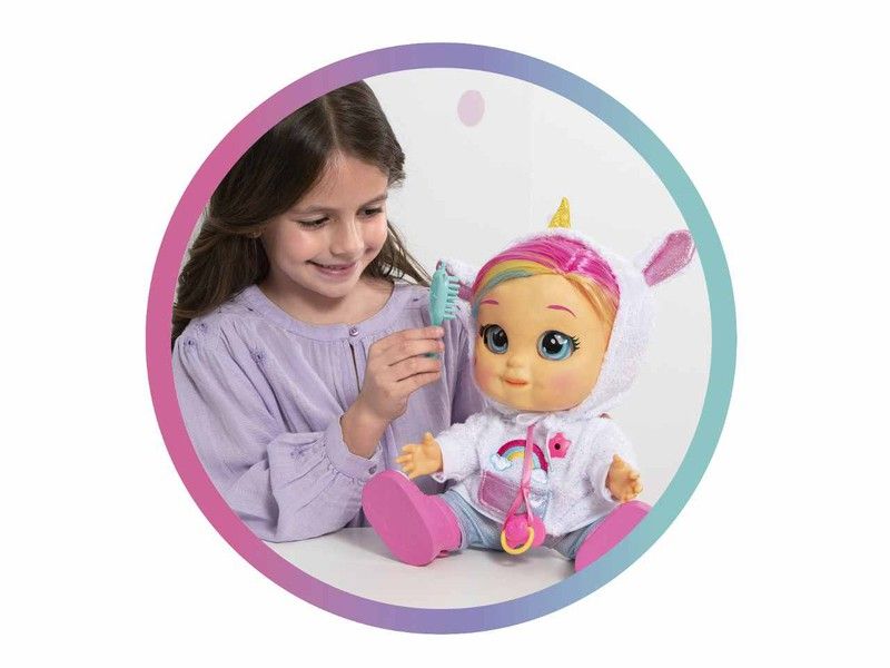 ¡Descubre el nuevo Bebé Llorón First Emotions Dreamy! Dreamy es el personaje estrella de los Bebés Llorones del mundo Fantasy, ¡un unicornio! Ahora, Dreamy tiene más de 65 expresiones, movimientos y sonidos de bebé... ¡ahora Dreamy cobra vida! Descubre sus primeras emociones y cuídala como su fuese tu bebé. Dreamy ríe cuando le haces cosquillas en la barriga, duerme si la acunas, bebe cuando le das su biberón y, como todos los Bebés Llorones, llora lágrimas de verdad cuando no tiene su chupete. Pónselo otra vez para que deje de llorar. Además, tiene pelo de verdad y multicolor así que podrás peinarla con su peine personalizado. Dreamy lleva ropa de verdad y zapatitos a juego. Dreamy trae 4 accesorios para que la puedas cuidar: su biberón, un sonajero personalizado en forma de helado, un peine y su chupete. Dreamy mide 33,5 cm.