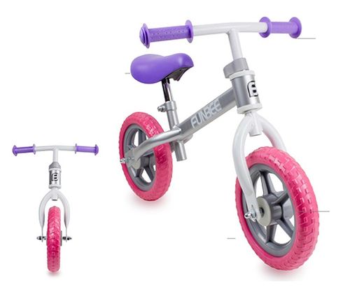 La Funbee de D'Arpeje es una bici de aluminio sin pedales con la que los niños mejoran su equilibrio. El sillín con dibujos se puede regular entre los 34 y los 46 cm y las ruedas se pueden hinchar.