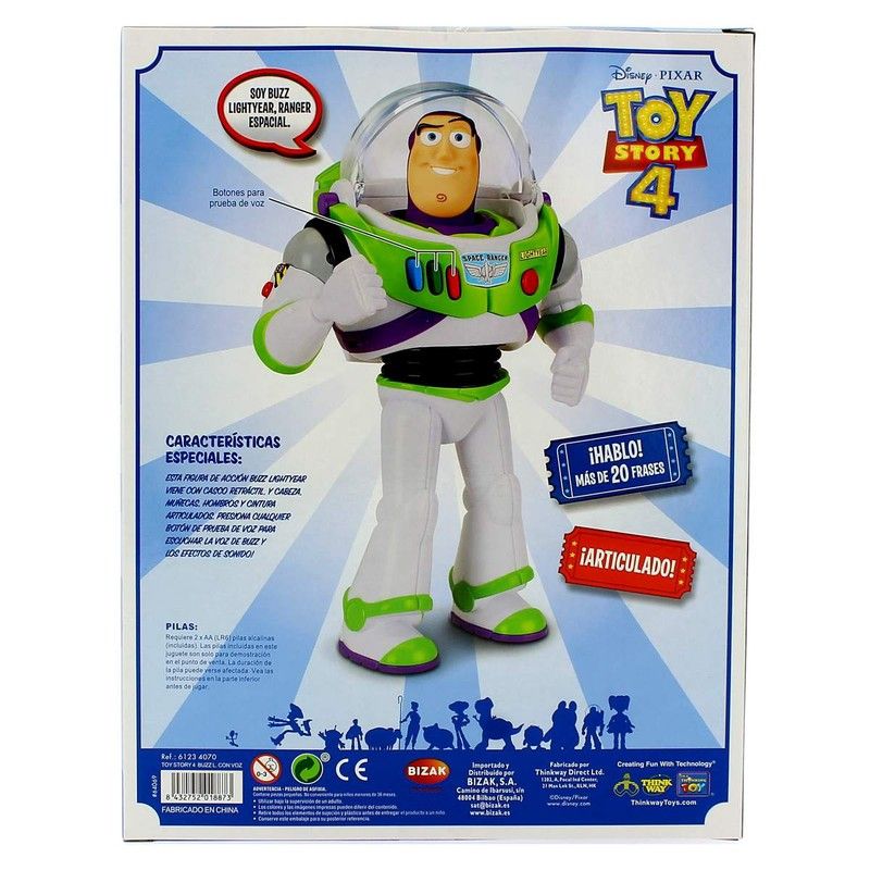 Esta figura de acción Buzz Lightyear con 30cm de altura viene con casco retráctil, y cabeza, muñecas, hombros y cintura articulados. Presiona cualquier botón de prueba de voz para escuchar la voz de de Buzz y ¡los efectos de sonido! ¡Más de 20 frases y sonidos!