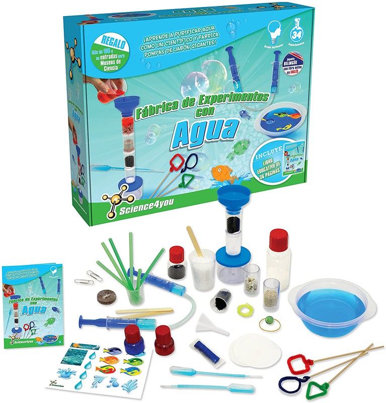 Contenido del kit: Libro educativo de 36 páginas, Filtro de agua, Grava, Arena, Carbón activado, Filtros de papel redondos, Embudo, Turba, Colorante alimentario azul, Colorante alimentario rojo, Pipetas Pasteur, Vasos de medición pequeños, Vaso de medición grande, Tubo de plástico transparente, Espátulas de madera, Sal marina, Goma, Cuenco de plástico, Pajitas, Hilo de lana, Plastilina, Canica, Jeringas, Alambres, Varillas de madera, Clips, Cartulina con elementos.