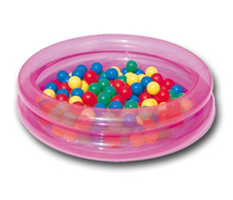 Una piscina hinchable en color rosa y tres tubos de aire.