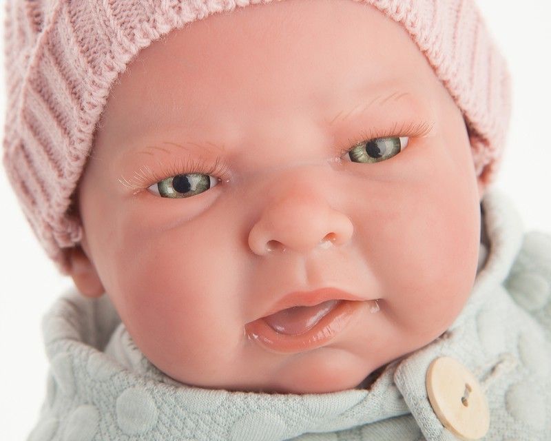 Sweet Reborn Lea con chaqueta verde, es como un auténtico bebé, con todas las características propias de un bebé de verdad: su piel sonrosada y suave, sus venitas, la manicura… Todo realizado a mano, para que sea un bebé como tú. Tiene el cuerpo de tela blandito para que le puedas dar suaves abrazos. Lea con chaqueta verde es un Reborn que va vestida con una bonita camisa de flores y un culotte con un lazo en la cintura. Con su gorro y calcetines a juego está preparada para salir a pasear contingo. ¿Qué me dices de su chaqueta verde? Tiene un tejido suave con graciosos puntitos. Su ropa está confeccionada con tejidos «Organic Cotton», lo que significa que en su cultivo y en su proceso de producción no se han utilizado productos químicos, solo naturales. Además lleva un pañal como un bebé de verdad. Puede colocarse en muchas posiciones como un bebé real porque sus extremidades giran, tiene movimiento, lo que le hace tener más realismo. Pesa 1340 gr. y mide 42 cm. ¡Y viene acompañado de su certificado de autenticidad, con una numeración única que garantiza su exclusividad como Reborn de Muñecas Antonio Juan! Incluye: · Chupete · Gorro · Blusa · Pantalones · Chaqueta · Pañal · Calcetines · Certificado de autenticidad