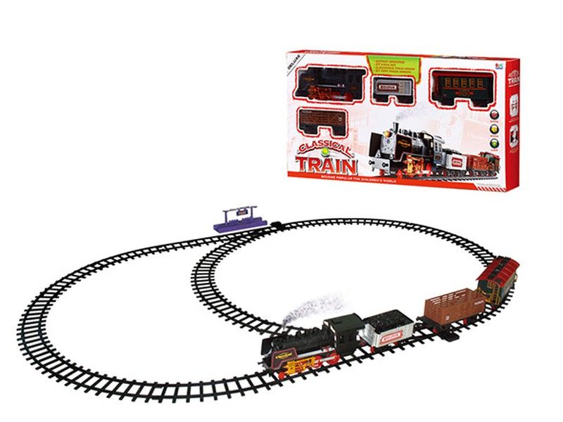 Un circuito de tren de estilo clásico con una preciosa locomotora con vagones.